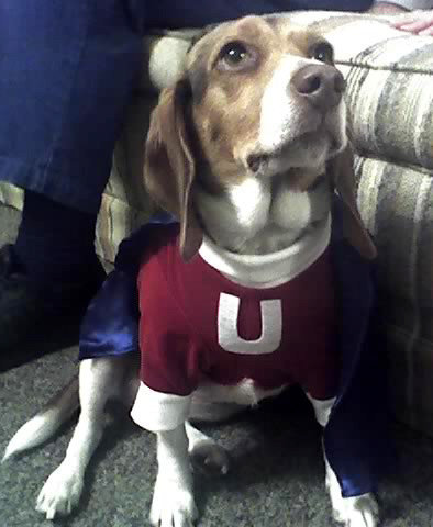 Here's my daughter's dog, Hazel, in full Halloween costume as designed by my mom.