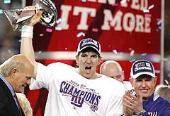 8:56pm - Eli Manning throws a touchdown pass to give the Giants the lead. Brother Peyton pumps his fist, and promises to honor his brother in yet another series of television commercials.