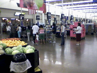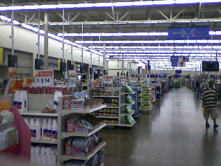 Here is where the next line is. Can you see it? No? That's because it's all the way at the other end of the store, so far away you'd need to ride one of those Harry Potter brooms to reach it. But those people headed down there are falling for an old trick, just watch! That exit of Wal-Mart is closed after ten o'clock. Ha! Imagine their faces when they have to walk to the other end of the store to check out, then realize they have to walk all the way back up here to get out! Won't that be fun? Please don't repeat any of the words they say, kids.