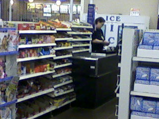 This is the woman who works at the register right next to the one where we're waiting. Doesn't she look happy? Happy happy happy. She should be happy because she's taking her break, and will not deal with us no matter how long the lines are. Don't worry, she doesn't make eye contact with anyone, kiddies. It's not just you.